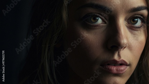A close-up expressive studio photo portrait of an attractive dreamy pensive blue eyed young woman looking straight at the camera standing against dark black background.
