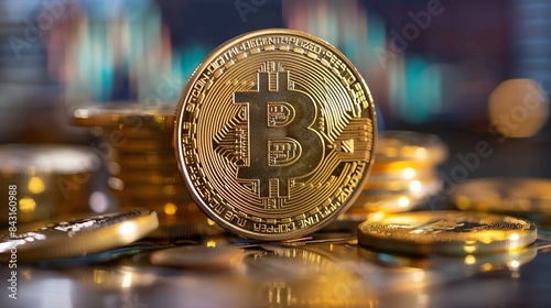 A close-up image of a gold Bitcoin coin. The coin is in focus, with a blurred background of other Bitcoin coins.
