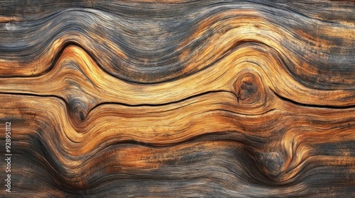 A close-up image of a wooden plank exhibiting natural swirling patterns with warm earth tones and hi