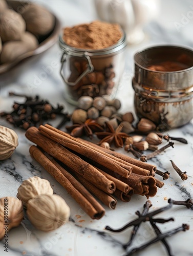 A close-up image of cinnamon sticks, cloves, vanilla pods, and other baking spices arranged on a kitchen countertop. Generative AI