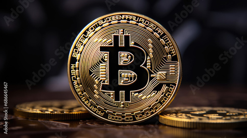 A close-up of a bitcoin coin on a dark background. Other bitcoin coins nearby.