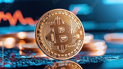 A close-up of a Bitcoin coin, representing cryptocurrency, with a digital background conveying financial trading and market dynamics.