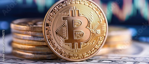 A close-up of a Bitcoin coin stacked with others, symbolizing cryptocurrency investment and digital finance trends.