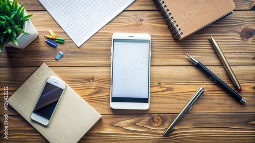 A close-up of a blank white smartphone screen on a wooden table, surrounded by scattered notes and pens, simulating a creative workspace setup.