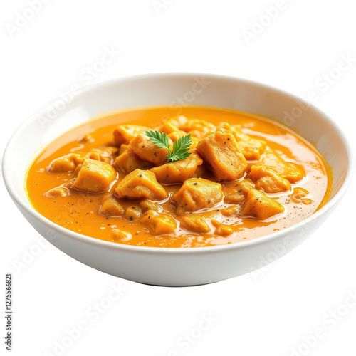A close-up of a bowl of rich, flavorful curry, with tender pieces of chicken and vegetables in a thick, golden sauce, garnished with fresh cilantro leaves on top.