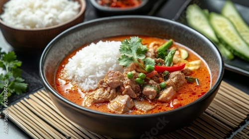 A close-up of a bowl of rich, textured consistency and bright red color, complemented by a side of jasmine rice and vegetable garnishes.