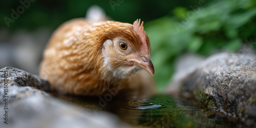 chicken, bird, animal, poultry, hen, feather, ecosystem, sharpened, eye, wildlife, fauna, sunlight, habitat, feathered, drinking, rural, beak, hydratation, domestic, avian, wild, healthy, caged, birding, water, green, nature, birdlife, environment, farm, natural, brown, fresh, stone, countryside, organic, closeup, agriculture