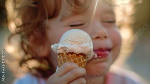 A close-up of a child's face as they lick an ice cream cone, their eyes closed in bliss and lips curved into a sweet smile.
