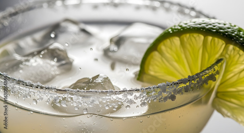 A close-up of a classic margarita cocktail with a salted rim and a fresh lime wedge.