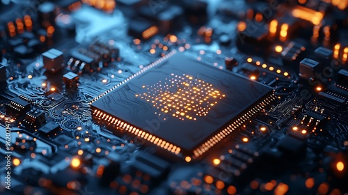 A close-up of a computer chip with glowing orange lights on a circuit board captures the essence of advanced technology.