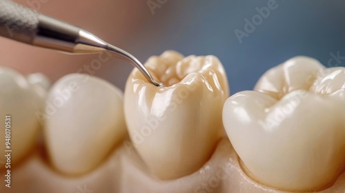 A close-up of a dental crown being placed on a tooth, showing the precision of restorative dentistry