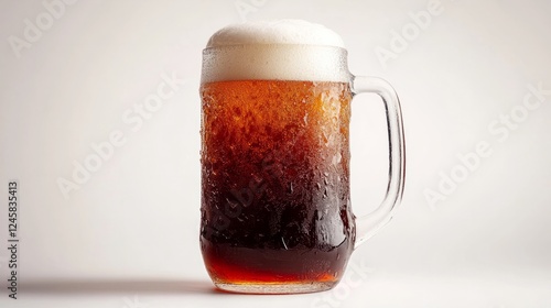 A close-up of a frosty jug of dark beer with foam, isolated on a clean white background, emphasizing texture and detail