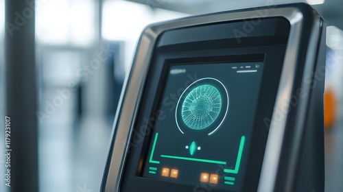 A close-up of a futuristic payment terminal displaying biometric authentication.