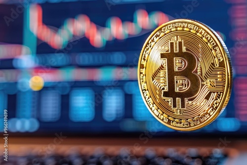 A closeup of a golden Bitcoin coin spinning in midair, surrounded by digital code and blockchain patterns, capturing the essence of cryptocurrency technology