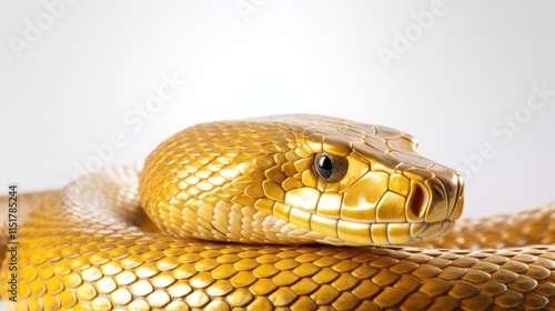 A close-up of a golden snake shimmering scales, its elegant body coiled into a perfect loop, standing out vividly on a pure white backdrop