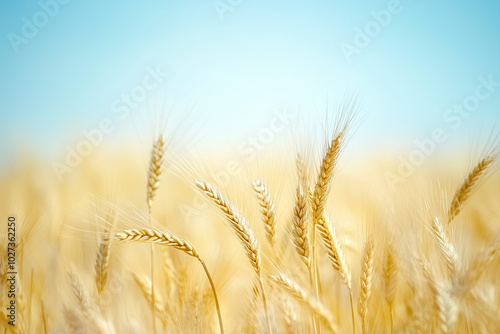A close-up of a golden wheat field, with a blurred background, a blue sky, and a warm color tone. The details are clear, and the saturation is high, with natural light and a shallow depth of focus.