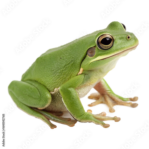 A close-up of a green tree frog sitting on a surface. The frog has smooth skin, large eyes, and a vibrant green color. It is positioned in a natural pose.