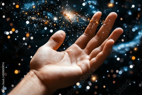 closeup, hand, reaching, out, toward, immensity, universe, distant, star, galaxy, struggle, find, connection, meaning