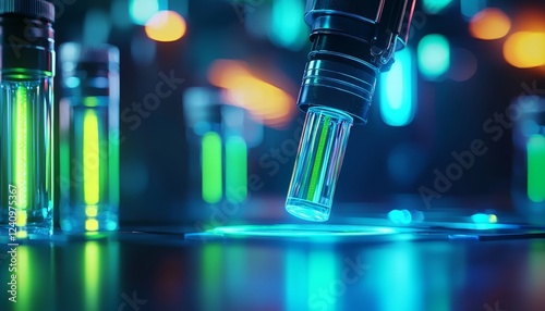 A close-up of a pipette dispensing liquid into a glowing test tube, surrounded by softly lit vials, creating a vibrant and scientific atmosphere.