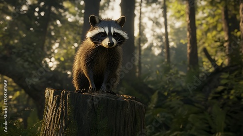 raccoon, forest, nature, wildlife, animal, mammal, cute, outdoors, timberland, stump, sunlight, green, tree, leaf, bark, ecosystem, fauna, natural, habitat, flora, adventure, portrait, curious, environment, furry, nocturnal, brown, black, white, playful, scenic, tranquil, detail, wild, biodiversity, animal portrait, wood, background, serene, exploration, wild animal, forest floor, lush, paw, explorer, spirit, bush