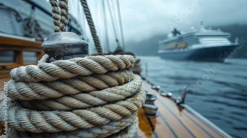 A close-up of a rope on a boat, with a cruise ship in the background, surrounded by serene water amid a misty atmosphere.