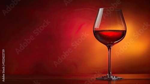 A close-up of a wine glass filled with red liquid, set against a warm, gradient backdrop of red and orange hues.