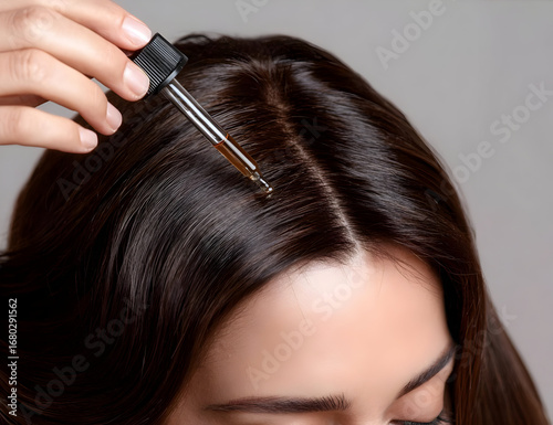 A close-up of a woman applying hair serum with a dropper, showcasing hair care and beauty routines for healthier hair.