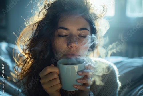 woman, sitting, bed, holding, cup, hot drink, steam, rise, eye, are, closed, first, sip, day, moment, quiet, enjoyment, key, part, daily, routine, setting, positive, tone, hours, ahead