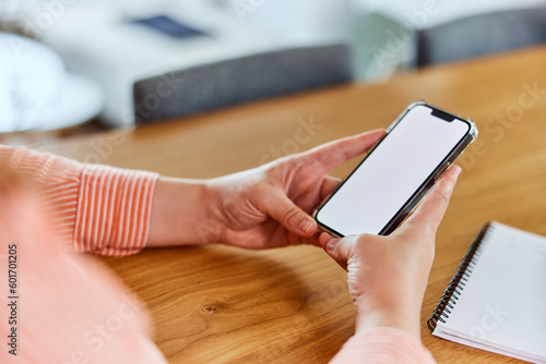 mobile phone, closeup, smartphone, white, table, indoor, woman, sharpened, screen, online, blank, hand, desk, shirt, notebook, technology, use, hold, female, sitting