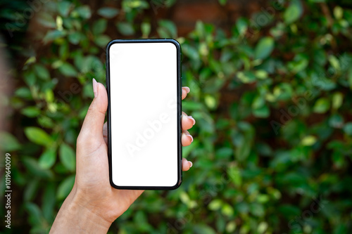 blank, mobile phone, communication, connection, copy space, device, display, empty, female, finger, hand, holding, cyberspace, lifestyle, mobile, mobile phone, modern, network, people, phone, screen, shopping, showing, smartphone, technology, template, touch screen, using, wireless, woman, closeup, chat, outdoors, outside, bush, green, garden, park, tree, nature, eco