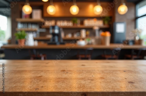 A close-up of a wooden table in a contemporary, cozy coffee shop. image with a copy space