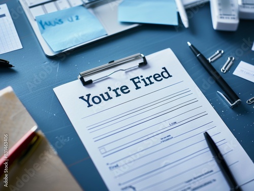 A close-up of a "You're Fired" letter lying on a desk, surrounded by scattered office supplies. The image focuses on the finality and impact of the termination notice.