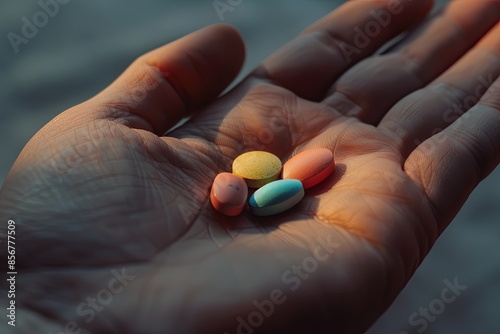 pill, medication, medicine, hand, palm, colourful, health care, health, treatment, pharmacy, drug, capsule, tablet, therapy, medicals, prescription, dosage, care, pharmaceutical, supplement, make well, wellness, remedy, healing, disease, disease, well-being, life, human, body, closeup, macro, soft, sharpened, blur, background, light, shadow, generative, ai