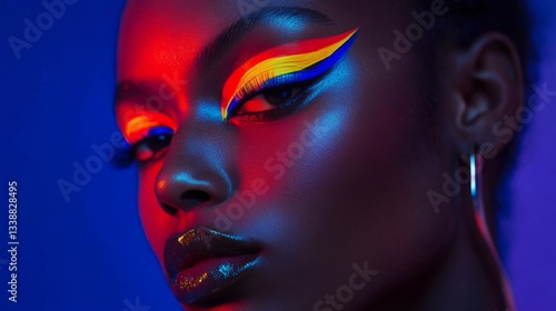 A close-up of bold, colorful eyeliner on an androgynous model, neon lighting, futuristic aesthetic