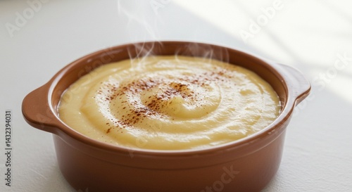 A close-up of creamy Brazilian canjica in a ceramic bowl, sprinkled with cinnamon and cloves, steam gently rising, soft morning light highlighting the texture, white background.