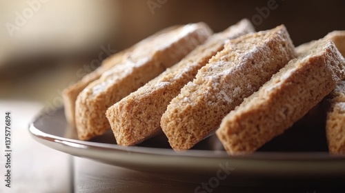 A close-up of delicate almond biscotti arranged neatly on a ceramic plate.