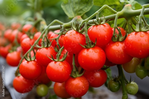A close-up of fresh red tomatoes hanging on a vine, showcasing their vibrant color and freshness.