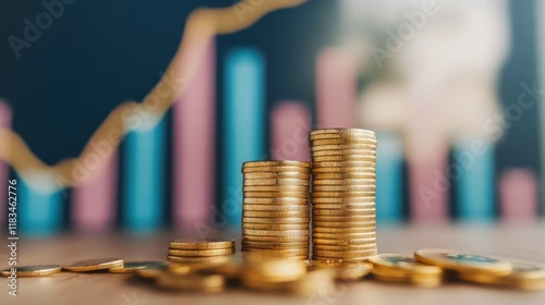A close-up of gold coins stacked on a table, with a blurred background featuring colorful bar graphs, symbolizing financial growth and investment.