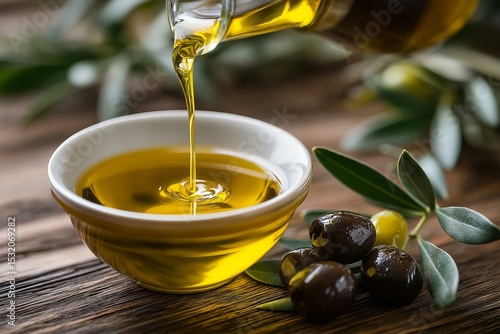 A close-up of olive oil being poured into a small bowl, surrounded by fresh olives and olive branches.