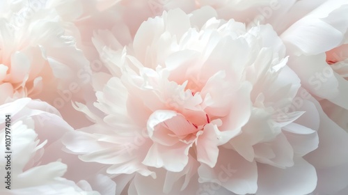 A close-up of soft pink and white peony flowers, showcasing their delicate petals.