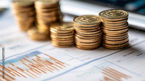 A close-up of stacked coins on financial charts, symbolizing investment, savings, and economic growth.
