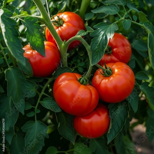 A close-up of tomatoes ripening on the vine, surrounded by healthy green foliage. Bright red tomatoes hang on a robust vine, nestled among lush green leaves.