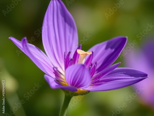 A close-up photo of a purple flower against a blurred green background