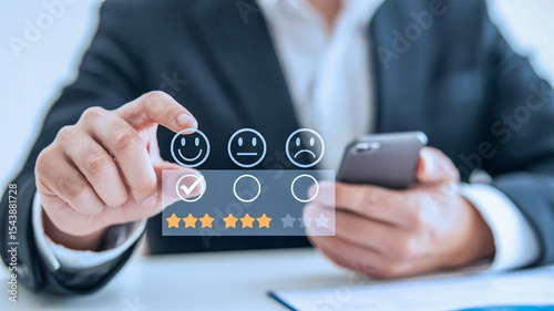 A close-up photograph of a hand in a black business suit interacting with a digital customer satisfaction rating interface