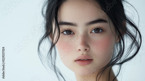 A close-up portrait of a beautiful young woman with dark black hair, and a serene expression, showcasing natural beauty and elegance and tranquility, professional studio portrait photography. White ba