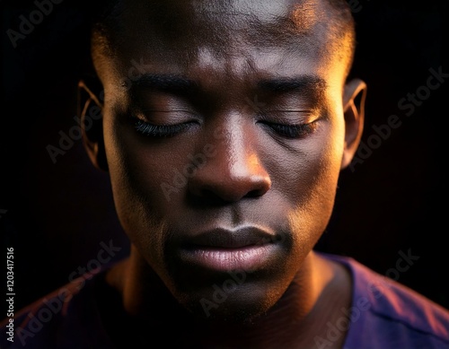 A close-up portrait of a Black gay man with a sad expression, looking downward with teary eyes.