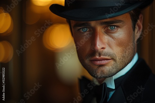 A close-up portrait of a dapper man wearing a classic top hat and suit, with intense blue eyes and a serious expression, portraying elegance and vintage charm in every detail.