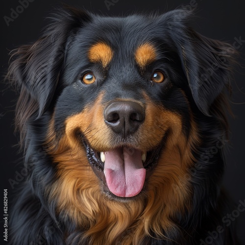dog, portrait, closeup, black, tan, happy, tongue, out, dark background, expressive, eye, perky, ear, pet, animal, fur, nose, smile, cheerful, joy, mammal, detailed, face, friendly, cute, adorable, canino, playful, head shot, furry