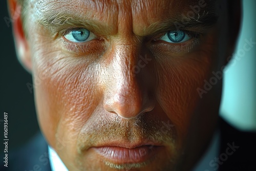 A close-up portrait showcasing a person's intense and focused expression with striking blue eyes, capturing the essence of human emotion and depth