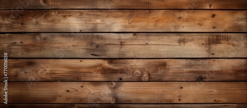 A closeup shot of a brown hardwood plank flooring with a wood stain pattern, resembling a brickwork pattern. The background is blurred